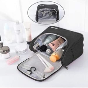 Room for your full and travel-sized toiletries, shaving supplies, cosmetics, and other grooming necessities, there is a large storage area, outside pocket with zipper
