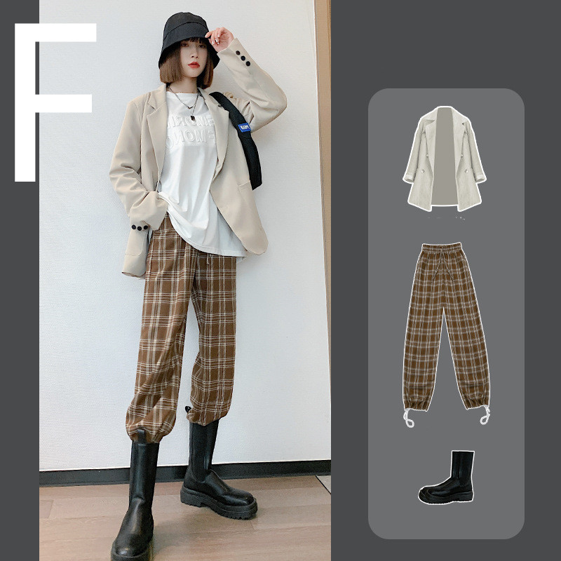 C: Spring and Autumn models-latte coffee grid [lace elastic waist] with pockets,
