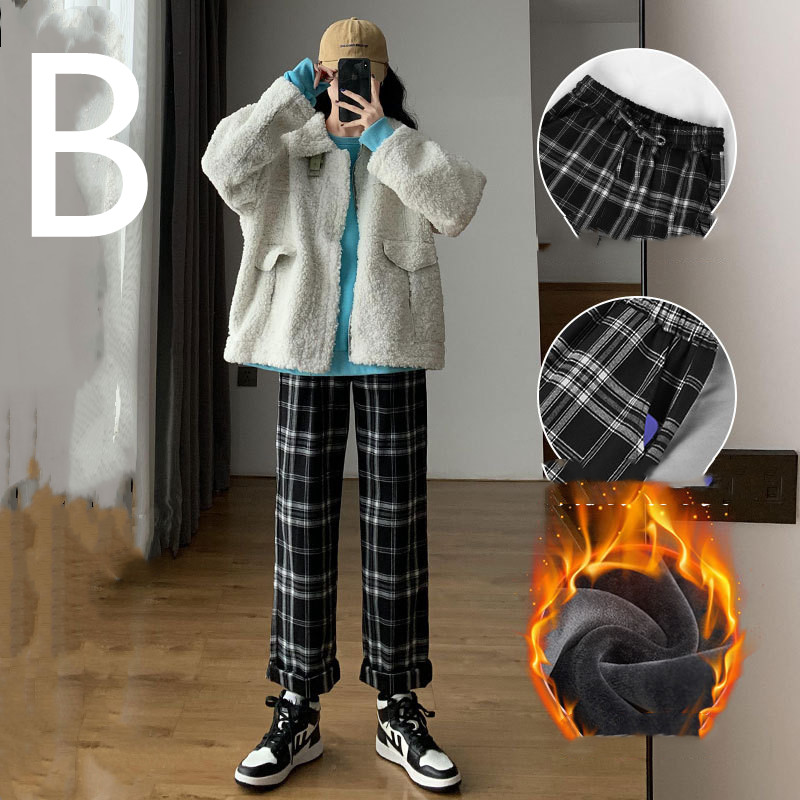 B: Plus cashmere-black and white plaid [lace elastic waist] with pockets,